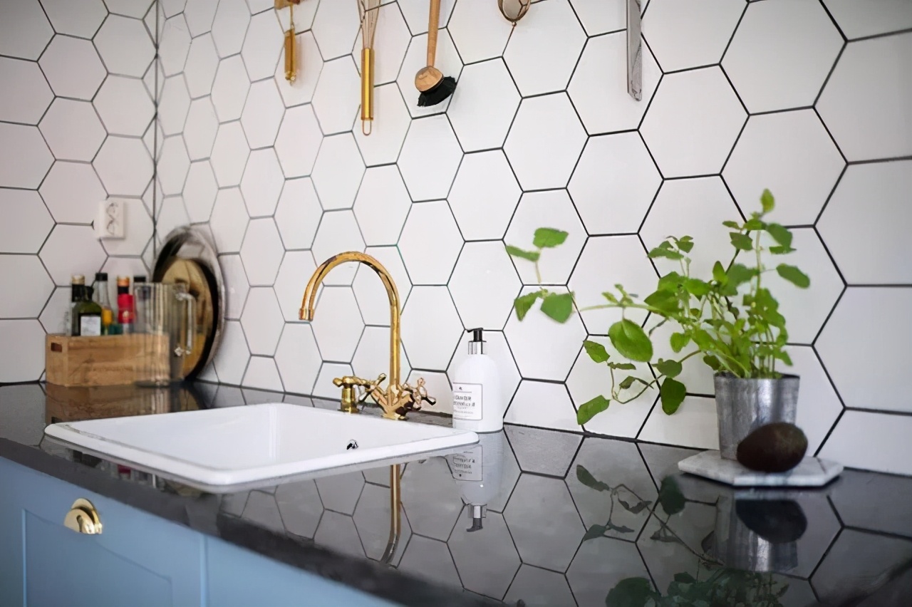 厨房定制了湖蓝色的橱柜,墙面选用白色六角墙砖,时尚干净,整面墙柜可以轻松解决两口之家各类厨房用具、餐具、食材、调料等用品的收纳,让整体空间整洁清爽。