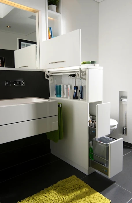 靠近洗漱台的部分,柜门上推,整齐摆放这一家人的电动牙刷、剃须刀,里面提前有规划插座,将这些电动用品收纳在这,除方便充电以外,还避免了与水的间接接触。